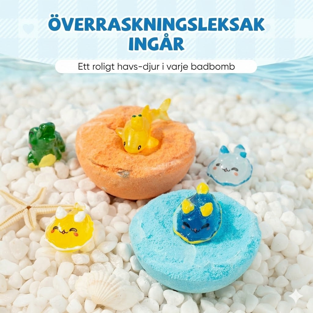 Har dina barn svårt att komma i badet? Dessa badbomber innehåller varsin söt havsdjursfigur och löser omedelbart kampen vid badtid genom att förvandla tvättandet till ett spännande äventyr. Det är det perfekta sättet att på ett lekfullt sätt lära barnen goda hygienvanor. Du kommer att märka att de framöver själva ber om att få bada för att få upptäcka sin nästa överraskning, vilket ger ett direkt resultat i en smidigare vardag.