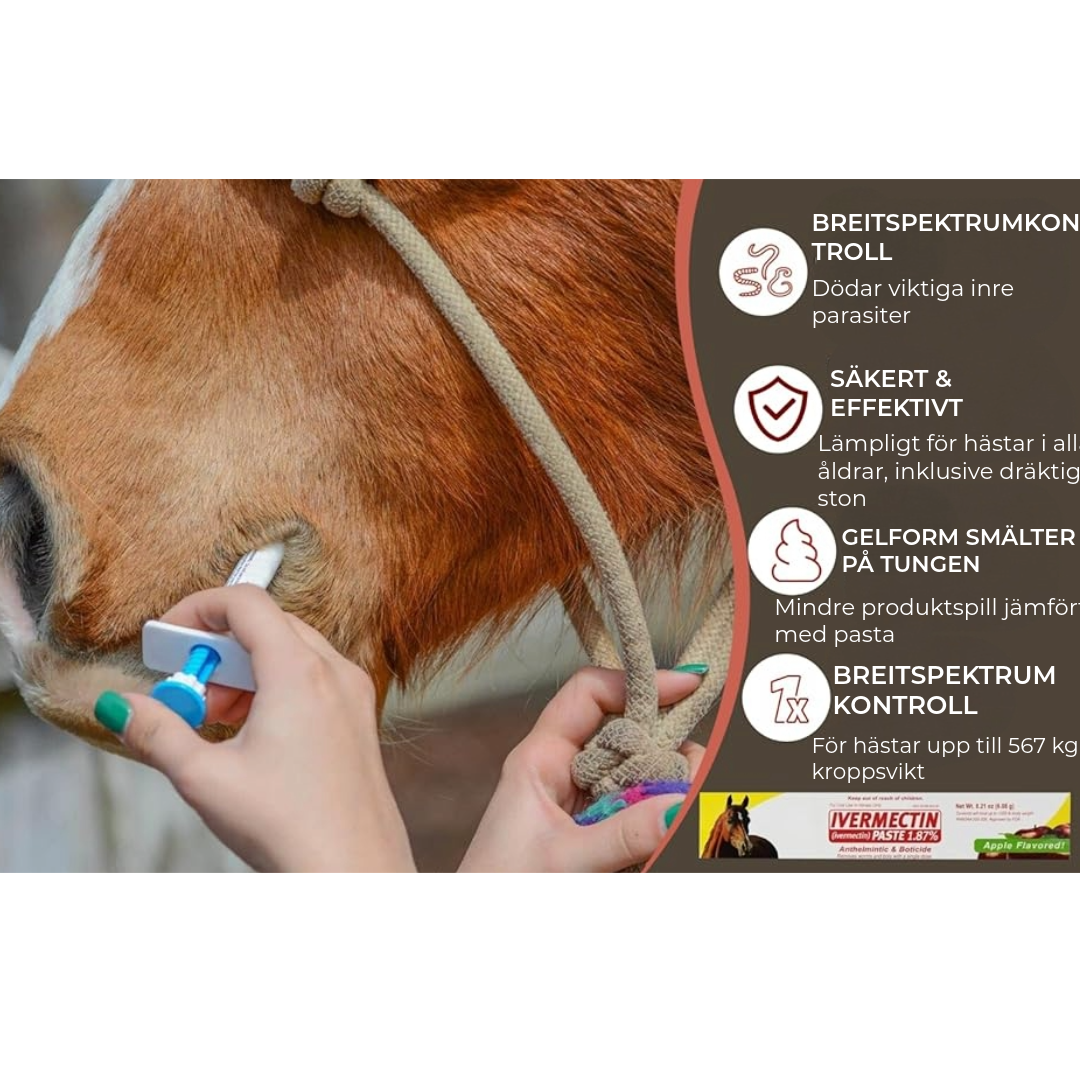 Tack vare den goda äppelsmaken och den praktiska doseringssprutan blir avmaskningen enkel och stressfri. Din häst accepterar pastan utan motstånd, vilket gör processen snabb, säker och bekväm. Med tydliga doseringsstreck kan du ge rätt mängd varje gång – utan risk för över- eller underdosering.