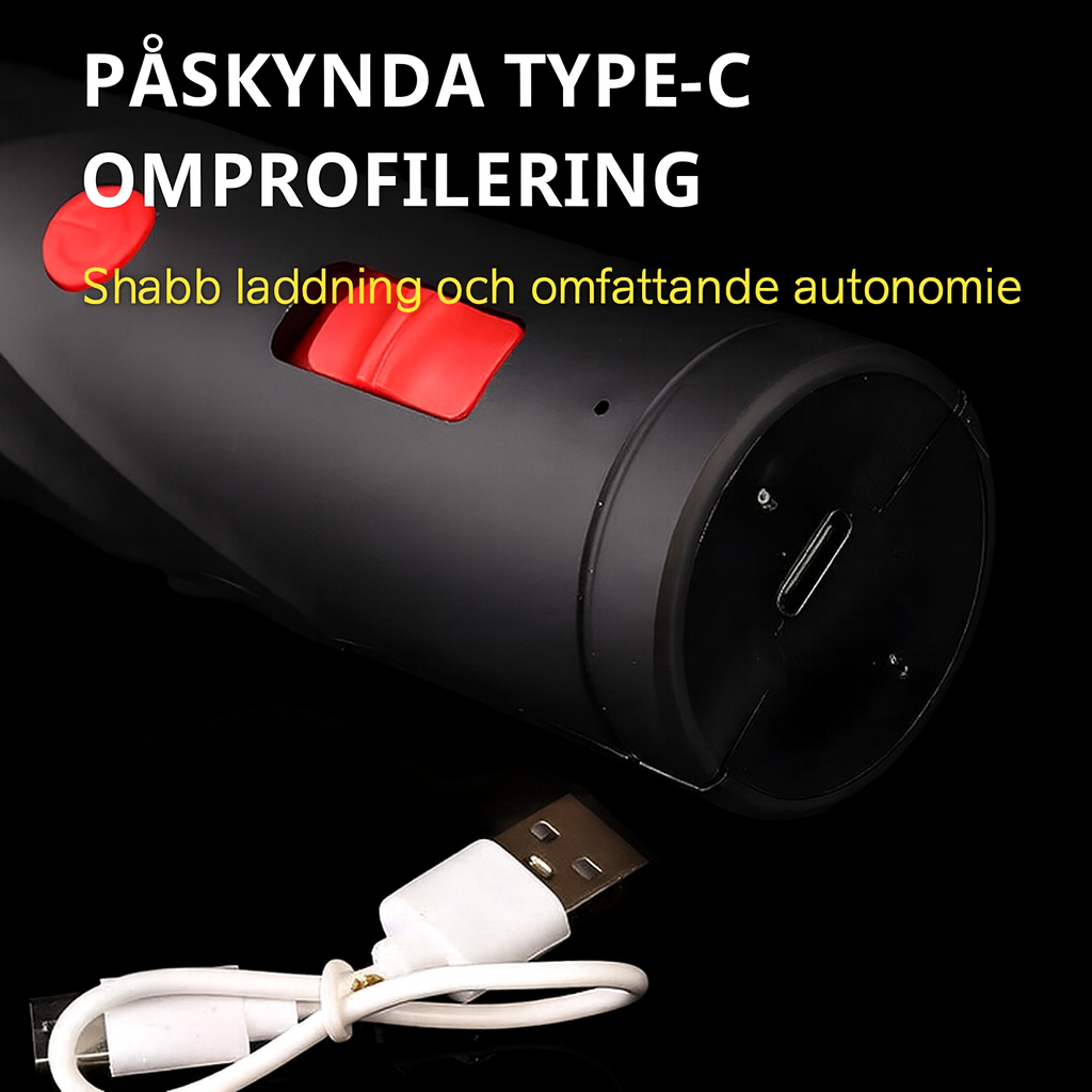 Med Type-C-anslutning och inbyggd smart chip laddas verktyget både snabbt och säkert. Inget mer krångel med speciella laddare – ladda hemma, i bilen eller via powerbank. Ett oumbärligt val för dig som vill vara förberedd och effektiv var du än är.