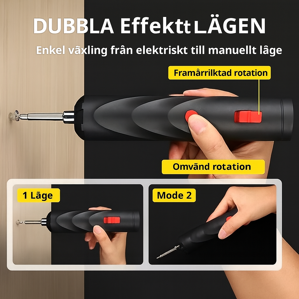 Växla enkelt mellan elektriskt läge för snabbhet och manuellt läge för exakta justeringar. Den kraftfulla motorn drar åt en skruv på bara en sekund, medan instant-stop-tekniken ger dig full kontroll när det verkligen behövs. Den ultimata lösningen för både grovjobb och precisionsarbete.